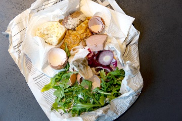 Am besten nimmt man dafür unbeschichtetes Zeitungspapier, das bindet die Feuchtigkeit besonders gut und darf in kleinen Mengen auch in die Biotonne wandern. Flüssigkeiten wie z. B. Soßen sollten Sie generell nicht über den Biomüll entsorgen, da es sonst zu Hygieneproblemen kommen kann.