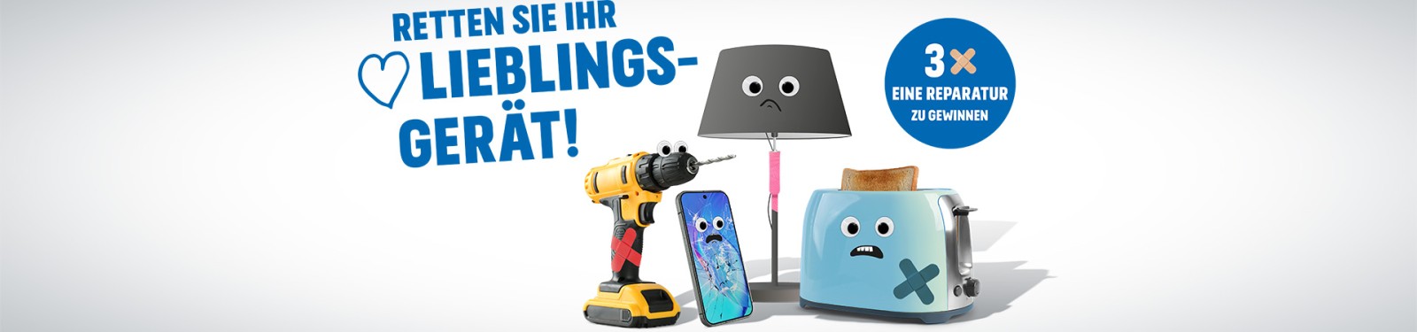 Wir helfen drei ausgewählten Gewinnerinnen oder Gewinnern, das Aktionswochen-Motto umzusetzen, und übernehmen die Reparatur für je ein heißgeliebtes Lieblings-Elektrogerät, dessen Reparatur bisher nicht wirtschaftlich erschien.